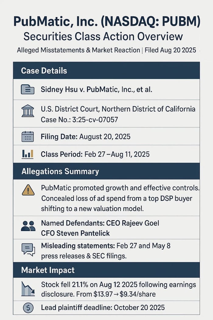 A securities fraud class action has been filed against PubMatic, Inc. (NASDAQ: PUBM) covering February 27, 2025 through August 11, 2025, inclusive. Investors allege the company promoted growth and effective controls while concealing that a top demand-side platform (DSP) buyer was shifting many clients to a new system that valued inventory differently, cutting ad spend and revenue. The complaint alleges that despite upbeat statements in late February and early May, management did not disclose this adverse trend. On August 11, 2025, PubMatic revealed a reduction in ad spend from a top DSP partner tied to this shift. The next day, the stock fell sharply by 21.1%, and investors who bought during the class period allege they were harmed by the inflation and subsequent drop.