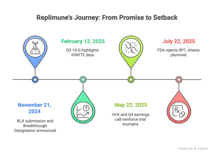 - July 22, 2025: The pivot. Pre-market, Replimune discloses FDA's Complete Response Letter, citing IGNYTE's inadequacy. Shares plunge about 77% to $2.80.