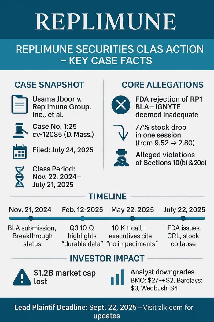 A biotech promise unravels. Replimune Group Inc., once heralded for its oncolytic virus platform targeting stubborn melanomas, now stands accused of painting too rosy a picture. On July 22, 2025, the FDA's complete response letter—rejecting the biologics license application for lead candidate RP1—sent REPL shares tumbling 77% in a single session. Investors, caught in the downdraft, filed a securities class action, alleging the company and its executives buried flaws in the pivotal IGNYTE trial.