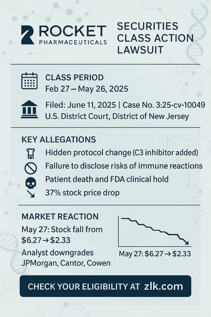 Rocket Pharmaceuticals, Inc. (NASDAQ: RCKT) is under fire. On June 11, 2025, a federal securities class action lawsuit was filed in New Jersey. It accuses the company and CEO Gaurav Shah of misleading investors about the safety of a clinical trial protocol. The case centers on statements made between late February and late May of this year, just before a sudden disclosure of a patient death and an FDA-imposed clinical hold sent the company’s stock into a 37% tailspin.