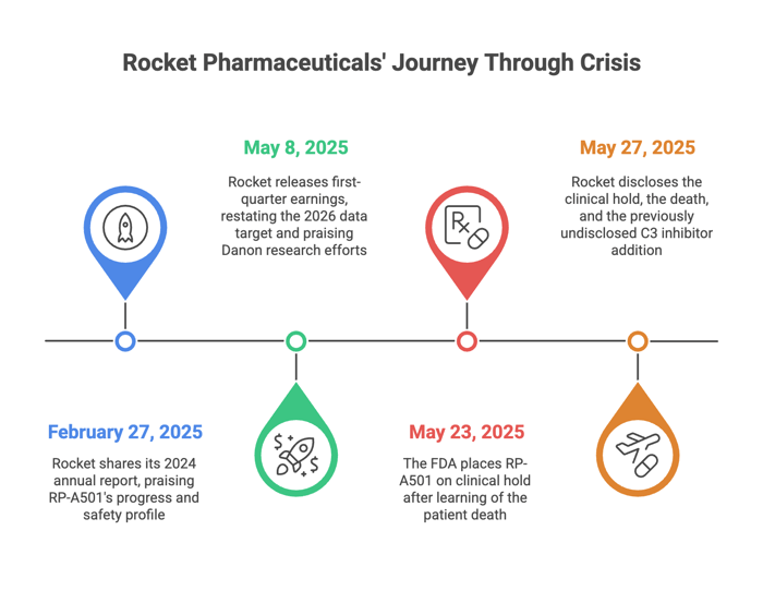 May 27, 2025: Rocket issues an 8-K disclosing the hold, the death, and—only then—the previously undisclosed C3 inhibitor addition. Shah states the change was made “several months ago.”