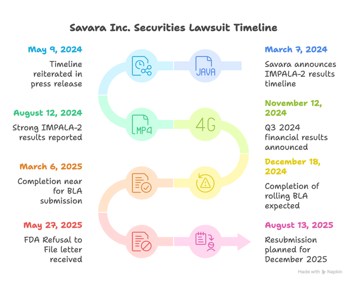 According to the complaint, this disclosure called into question prior statements that the rolling submission would be completed by the end of the first quarter of 2025 and that a path to potential approval by year-end 2025, if priority review were granted, was open. On August 13, 2025, after the Class Period, Savara issued a press release that it now planned to resubmit the MOLBREEVI BLA in December 2025.