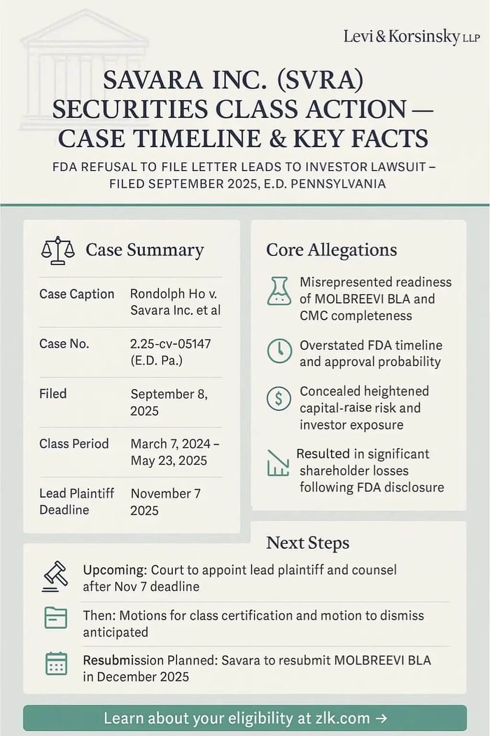 A federal securities class action has been filed against Savara Inc. (NASDAQ: SVRA) in the U.S. District Court for the Eastern District of Pennsylvania. The lawsuit covers investors who acquired Savara securities between March 7, 2024 and May 23, 2025, both dates inclusive. Investors allege the Company misrepresented the readiness and timeline of its Biologics License Application (BLA) for MOLBREEVI, including whether it contained sufficient Chemistry, Manufacturing, and Controls (CMC) information and the likelihood of timely FDA approval. The story turned on May 27, 2025, when Savara disclosed an FDA Refusal to File letter stating the March 2025 BLA was not sufficiently complete and needed more CMC data. On this news, the stock fell sharply, and plaintiffs claim significant losses followed.