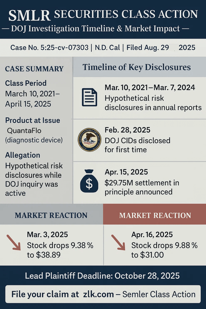 A securities fraud class action has been filed against Semler Scientific, Inc. (NASDAQ: SMLR) in the Northern District of California. The proposed class covers investors who acquired Semler securities between March 10, 2021 and April 15, 2025, both dates inclusive. According to the complaint, investors allege the Company discussed False Claims Act risk and DOJ enforcement only in hypothetical terms while failing to disclose that a real DOJ investigation under the False Claims Act had been underway for years. The truth surfaced when Semler disclosed the DOJ's civil investigative demands and later an agreement in principle to settle for $29.75 million. Following these disclosures, the stock fell sharply on two separate trading days.