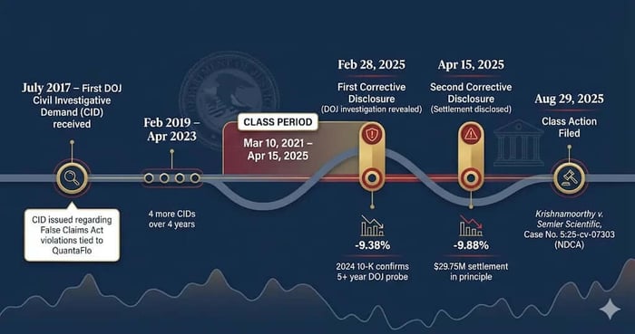 July 2017: Semler Scientific receives an initial Civil Investigative Demand (CID) from the DOJ related to potential False Claims Act violations concerning the marketing of QuantaFlo tests as reimbursable by Medicare.