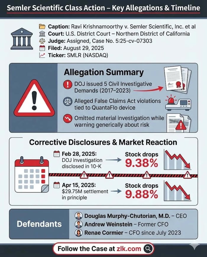 Semler Scientific, Inc., a healthcare technology company that has notably branched into Bitcoin investing, is facing a securities class action lawsuit alleging that the company and its top executives knowingly concealed a material investigation by the U.S. Department of Justice (DOJ) into violations of the False Claims Act. The lawsuit, filed on behalf of investors who acquired Semler securities between March 10, 2021, and April 15, 2025 , claims that the omission of the DOJ Civil Investigative Demands (CIDs) rendered the Company's public risk disclosures about government scrutiny "materially false and misleading."