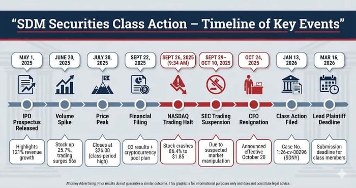 Investors allege the company misled the market about its business, operations, and the true nature of trading in its stock, while omitting the realized risk of manipulation, including a social media-based promotion campaign and a potential trading suspension. The truth began to surface when NASDAQ halted trading for volatility on September 26, 2025 and the Securities and Exchange Commission (“SEC”) suspended trading pursuant to a trading suspension order from September 29 through October 10, 2025 due to suspected social media-driven activity and market manipulation. As a result, SDM's stock collapsed 86.4% in a single day, causing severe harm to investors and significant shareholder losses.