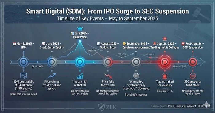 The alleged scheme unfolded quickly. After the May 2025 IPO, Smart Digital’s stock began rising sharply in June, accompanied by sudden and unexplained spikes in trading volume. By late July, the shares reached an intraday high of $29.40—more than seven times the offering price—despite no corresponding business announcements.