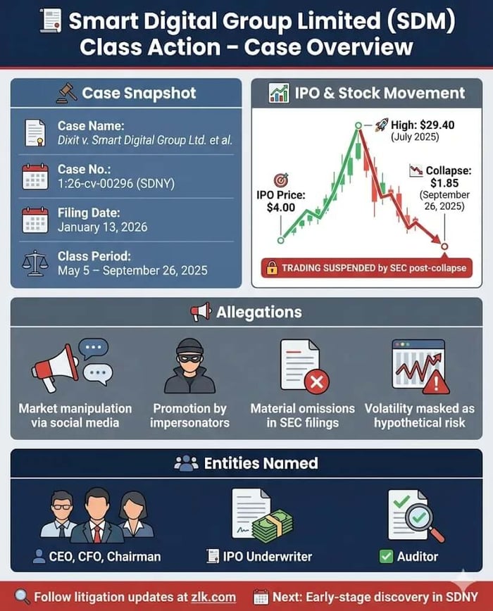 Smart Digital Group Limited did not stumble quietly. According to the complaint, it surged, spiked, and then imploded—taking retail investors with it. In January 2026, a federal securities class action was filed in the Southern District of New York alleging that Smart Digital Group Limited and its executives sold the market a company narrative while its stock traded inside a manipulated reality.