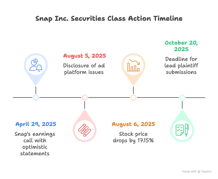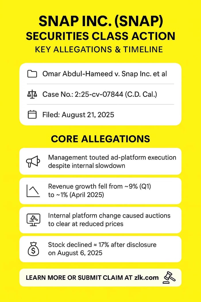 A federal securities fraud class action has been filed against Snap Inc. (NYSE: SNAP) covering April 29, 2025 through August 5, 2025, inclusive. Investors allege the company misled the market by expressing confidence in its ad platform and execution while providing assurances about advertising revenue expectations for Q2 and full-year 2025. Behind those assurances, the complaint states that advertising revenue growth had fallen sharply—from about 9% in the first quarter to approximately 1% in April—due to Snap's own execution failure. The truth allegedly surfaced when management later revealed an internal ad platform change caused auctions to clear at reduced prices, depressing revenue. After the disclosure, Snap's stock fell sharply, affecting investors who bought during the class period.