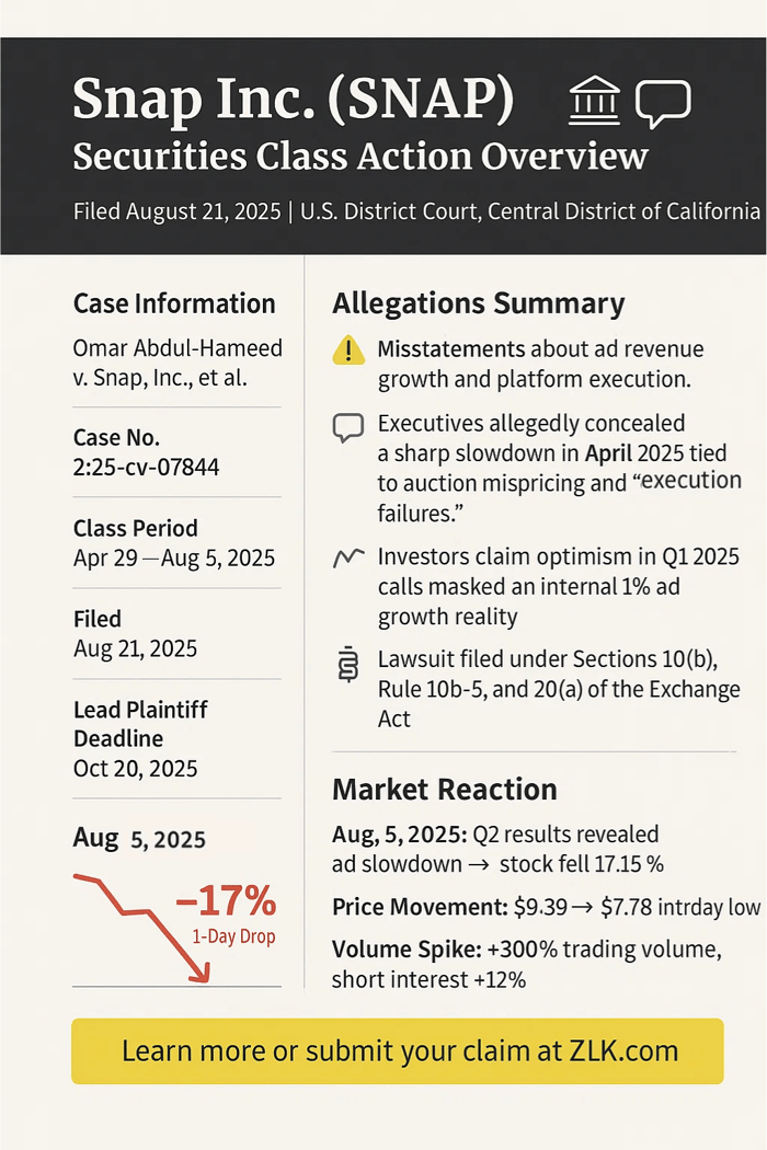 This suit targets the period from April 29, 2025 to August 5, 2025, alleging violations under Sections 10(b) and 20(a) of the Securities Exchange Act. At its heart: claims that Snap disseminated materially false statements about ad revenue health, concealing operational stumbles amid a competitive digital ad landscape. The case underscores the fragility of ad-dependent models in social media, where user engagement meets the cold calculus of algorithmic auctions. As class action counsel circle, the case probes deeper questions of disclosure timing and executive accountability. Ahead, we unpack the business undercurrents, the chasm between boardroom boasts and backend breakdowns, and the ripples for portfolios heavy in tech.