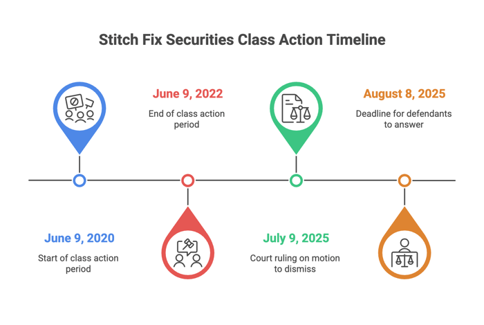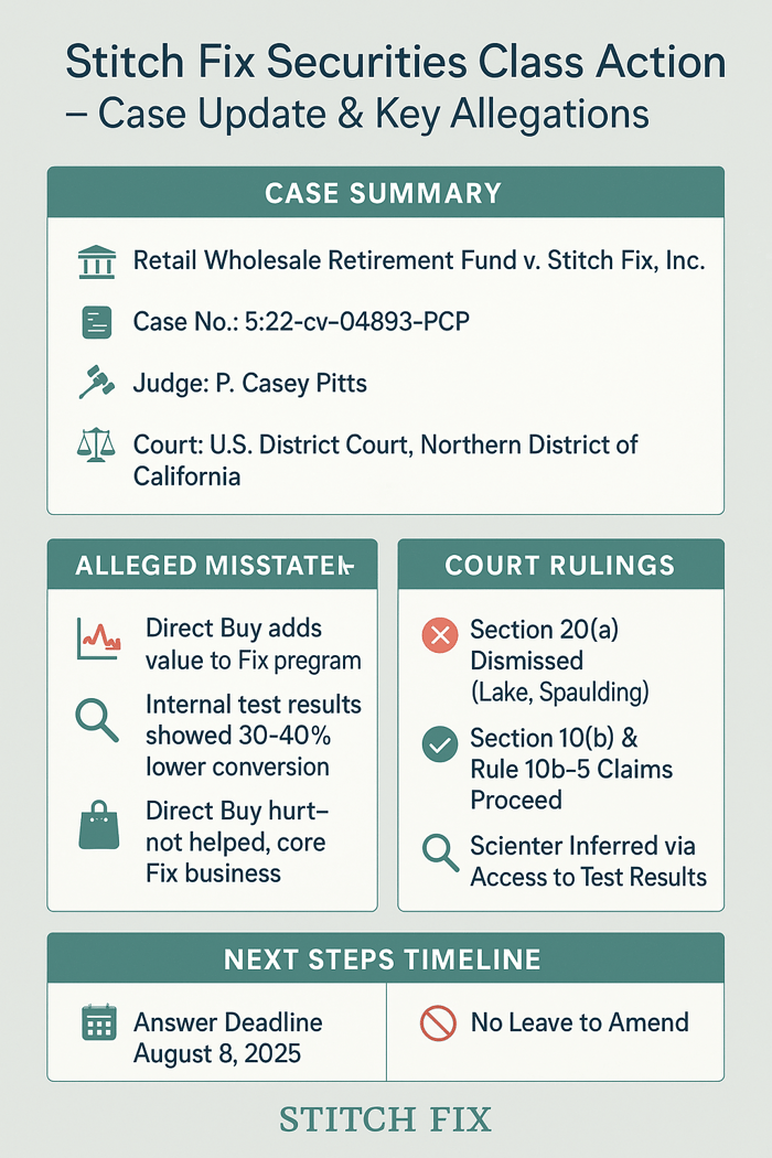 On July 9, 2025, Judge P. Casey Pitts partially granted a motion to dismiss in Retail Wholesale Retirement Fund v. Stitch Fix, Inc., dismissing with prejudice Section 20(a) claims against former executives Katrina Lake and Elizabeth Spaulding. The Court allowed Section 10(b) and Rule 10b-5 claims against Stitch Fix, Lake, and Spaulding to move forward, finding four statements about the Direct Buy program’s benefits were misleading based on internal test results showing harm to the core Fix business.