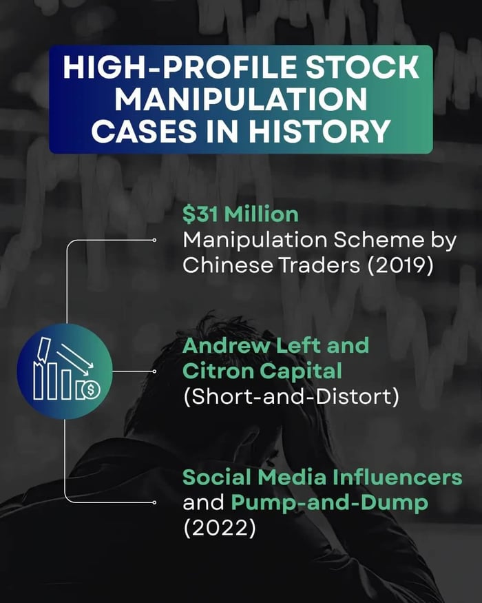 Examples include pump-and-dump schemes (social media influencers), wash trading (Montgomery Street Research), and short-and-distort campaigns (Andrew Left).