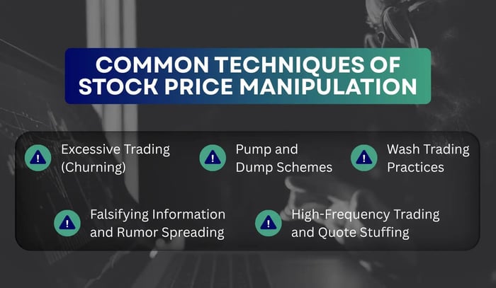 Price manipulation techniques include pump and dump, wash trading, churning, spreading false information, and quote stuffing.