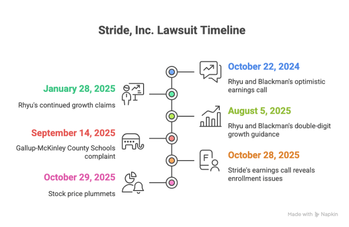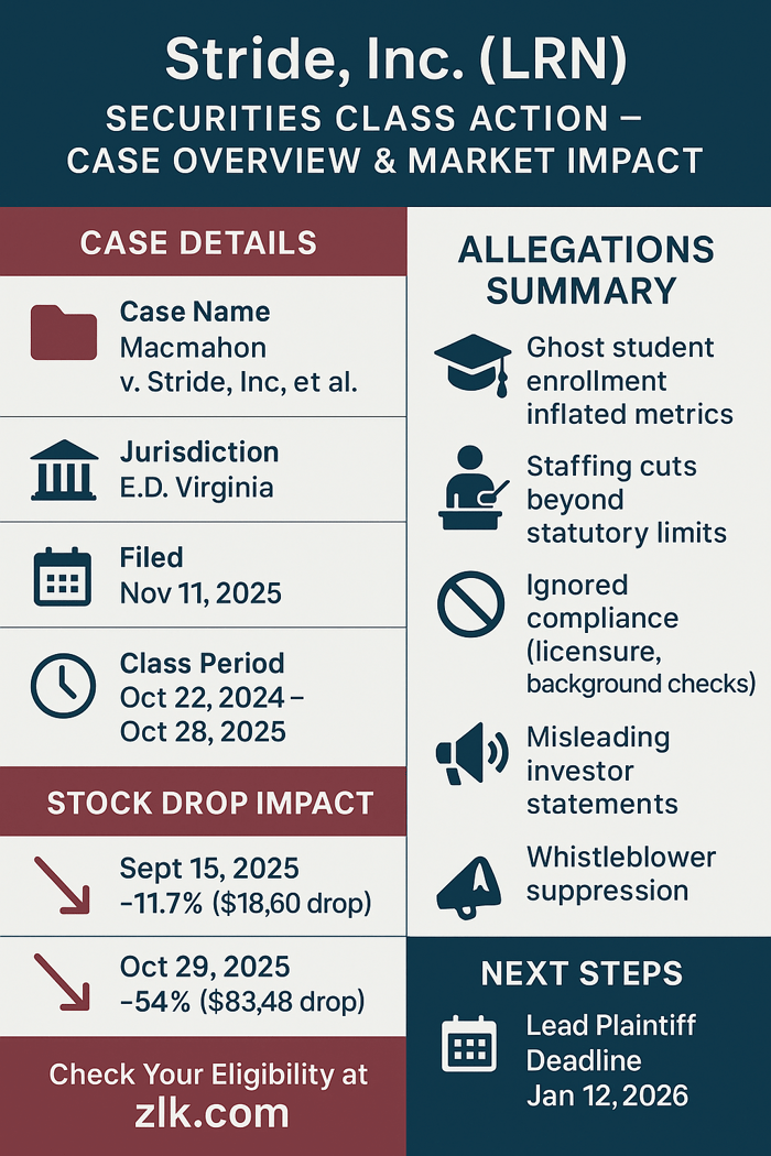 A federal securities fraud class action has been filed against Stride, Inc. (NYSE: LRN) covering October 22, 2024 through October 28, 2025. Investors allege the company touted itself as one of the nation's most successful technology-based education companies with deep educational, regulatory, and policy expertise while concealing operational and compliance problems. According to the complaint, Stride was inflating enrollment numbers, cutting staff costs beyond required statutory limits, ignoring compliance requirements, and losing existing and potential enrollments. The story turned when a school district's lawsuit exposed alleged ghost-student practices in September 2025 and, weeks later, Stride's management admitted 10,000 to 15,000 fewer enrollments due to poor customer experience, higher withdrawal rates, and lower conversion rates. Investors saw sharp stock declines on September 15, 2025 and again on October 29, 2025, allegedly causing significant losses.