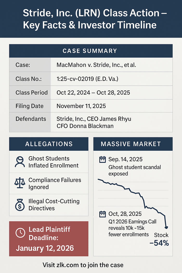 A reckoning has come for Stride, Inc. (NYSE: LRN), the nation’s prominent provider of online educational services. A recently filed securities class action lawsuit alleges that the digital learning company’s meteoric rise was constructed on a foundation of misrepresentation, specifically concerning its most vital metric: student enrollment. The complaint alleges Stride systematically misled investors during the Class Period by inflating its student rolls with "ghost students" and strategically undercutting essential compliance and staffing requirements to boost profit margins. This alleged deception, the lawsuit contends, culminated in two massive stock drops, wiping out billions in market capitalization and leaving LRN investors in financial devastation.