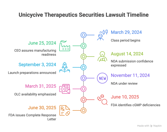 Days after the class period ended on June 27, 2025, additional FDA-related developments were disclosed. On June 30, 2025, Unicycive announced the FDA had issued a CRL for the OLC NDA to treat hyperphosphatemia in CKD patients on dialysis, citing the same cGMP deficiencies at the third‑party subcontractor. According to the complaint, these developments allegedly showed that prior assurances about manufacturing readiness and the NDA's regulatory prospects were overstated.