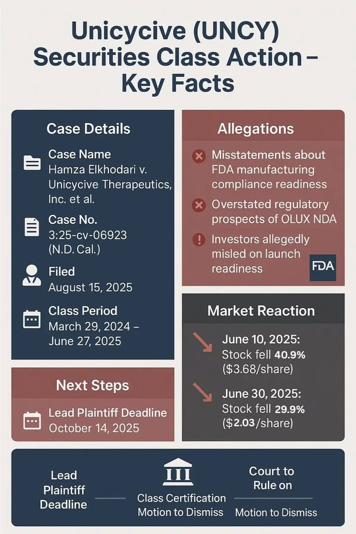 A federal securities fraud class action has been filed against Unicycive Therapeutics, Inc. (NASDAQ: UNCY) covering March 29, 2024 through June 27, 2025. Investors allege the company overstated its readiness to meet FDA manufacturing compliance requirements and exaggerated the regulatory prospects of its NDA for oxylanthanum carbonate (OLC). During June 2025, the FDA identified cGMP deficiencies at a third-party manufacturing vendor and later issued a Complete Response Letter (CRL) citing those deficiencies. On these revelations, Unicycive's stock fell sharply on two separate trading days. The complaint was filed on August 15, 2025, in the U.S. District Court, Northern District of California.