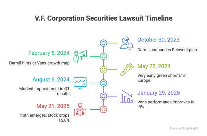 According to the complaint, V.F. Corporation and senior executives—President and CEO Bracken P. Darrell, former CFO Matthew H. Puckett (serving until July 8, 2024), and CFO Paul Aaron Vogel (serving from July 8, 2024)—promoted the Reinvent plan as the path to fix Vans and return it to growth. They allegedly assured investors that brand-building, execution, and financial discipline would drive improvement.