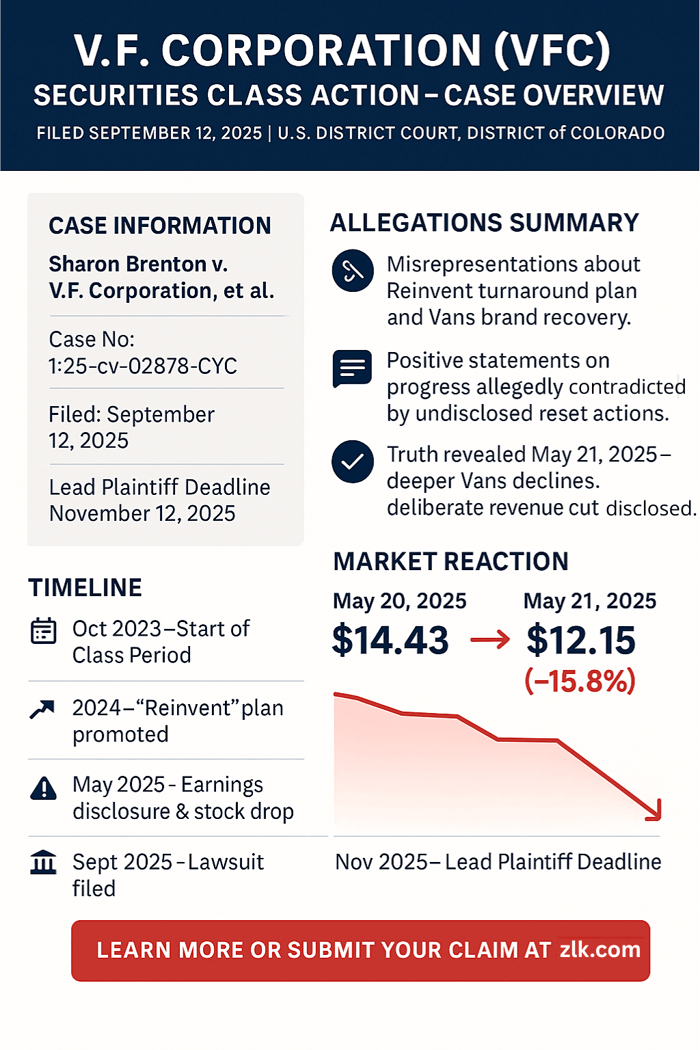 A federal securities fraud class action has been filed against V.F. Corporation (NYSE: VFC) in the U.S. District Court for the District of Colorado. The alleged class period runs from October 30, 2023 to May 20, 2025, inclusive. Investors allege defendants misrepresented the progress and trajectory of the company's "Reinvent" turnaround plan, especially the effort to return the Vans brand to growth. The complaint says the truth emerged on May 21, 2025, when V.F. Corporation disclosed deeper Vans declines tied to deliberate revenue cuts and additional reset actions that had been in place but not previously announced. Following these revelations, investors experienced swift losses as the stock fell sharply.