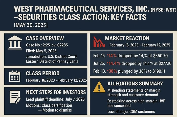 The West Pharma lawsuit alleges West and some of its executives violated federal securities laws by making materially false and misleading statements about its business operations and prospects, concealing mounting financial risks tied to contract manufacturing headwinds, continuous glucose monitoring contracts, and high margin HVP portfolio challenges.