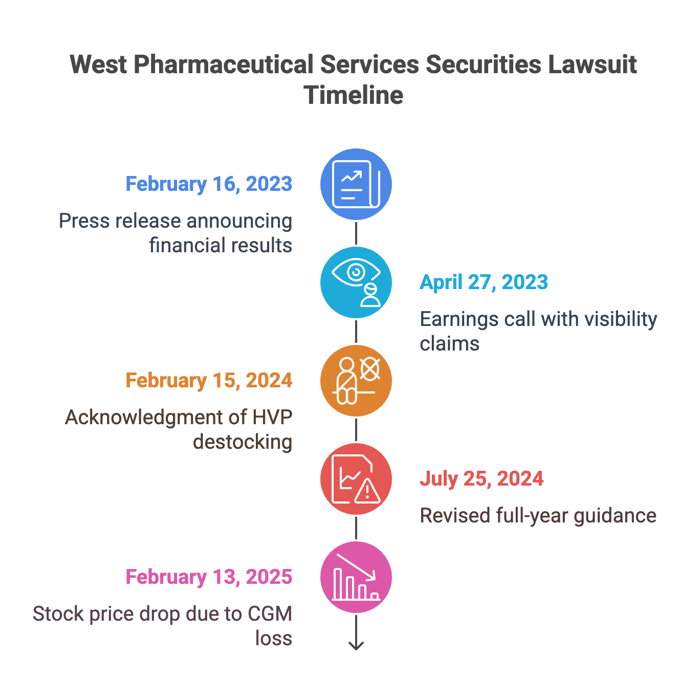 The filed complaint alleges that West Pharmaceutical Services, Inc. made materially false and misleading statements regarding its operational performance, demand visibility, and strategic positioning throughout the Class Period. Specifically, Defendants' positive statements regarding customer demand and product performance failed to reflect significant and ongoing destocking across its high margin HVP portfolio.