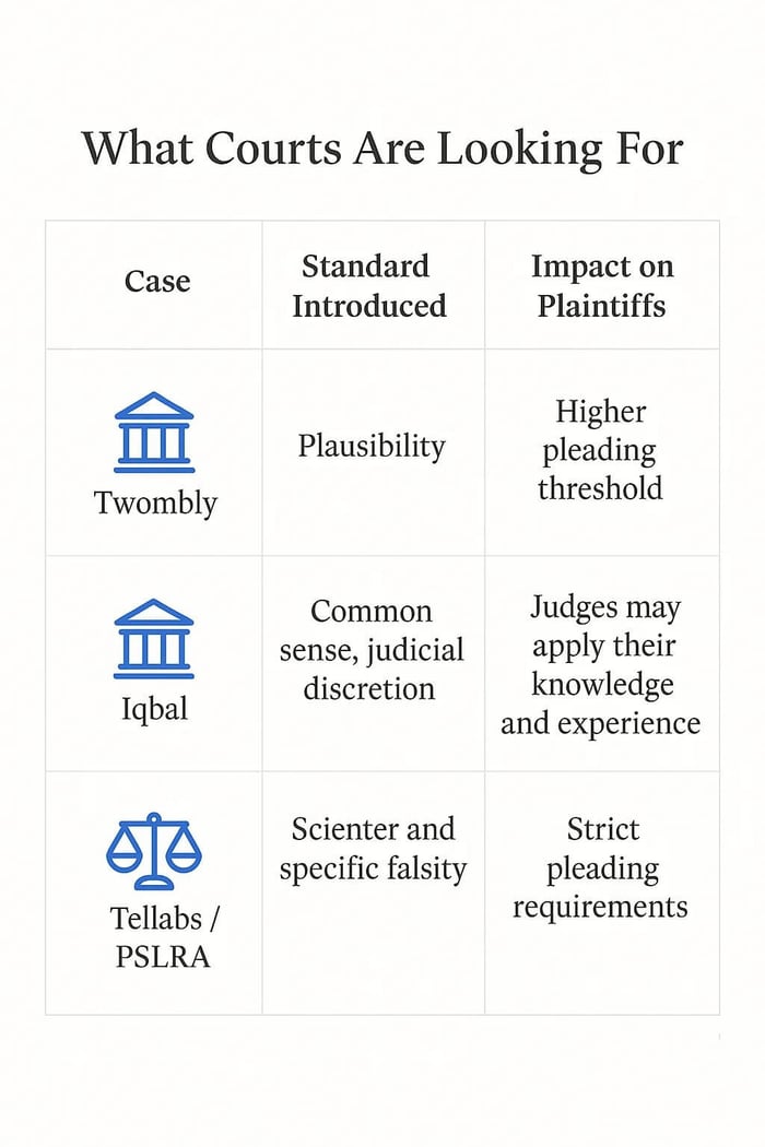 In securities fraud cases, the bar is even higher due to the Private Securities Litigation Reform Act (PSLRA). Investors must specify exactly what statements were false, why they were false, and provide particularized facts to support these claims (15 U.S.C. §78u-4(b)). They also have to show what’s called a “strong inference” of scienter which is that the company acted intentionally or with reckless disregard for the truth. The case Tellabs, Inc. v. Makor Issues & Rights, Ltd., 551 U.S. 308 (2007), made it clear: vague or conclusory accusations are not enough.