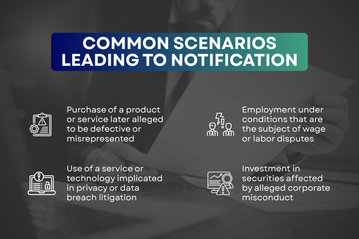 For example, you may have purchased a specific product during a particular time frame, worked for a company under certain conditions, or had your data compromised in a breach. The notice will specify the class definition and the corresponding time.
